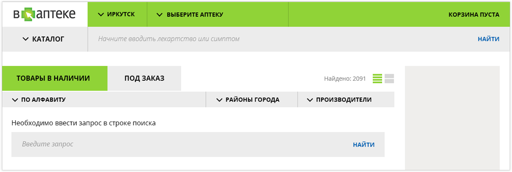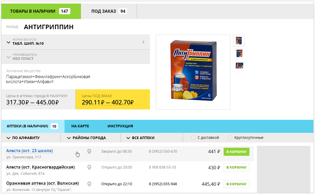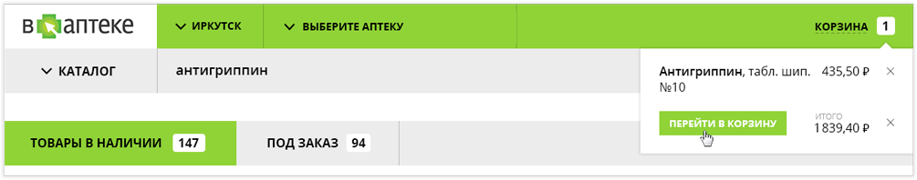 выбрать товар в нужной аптеке и положить его в корзину.